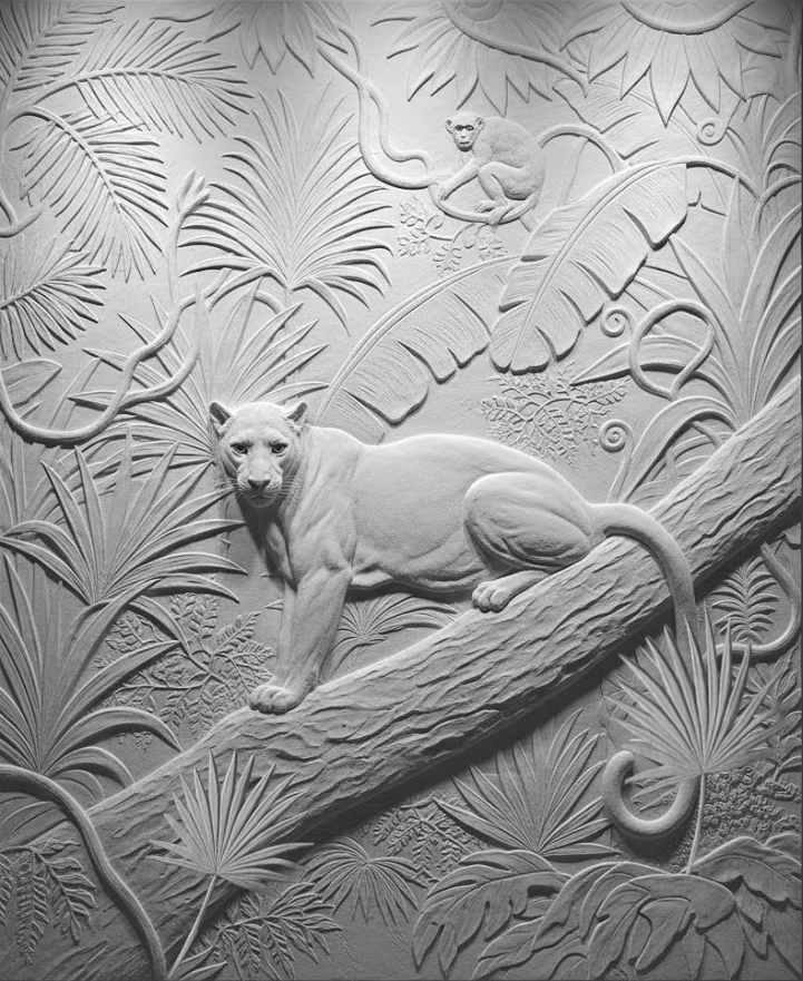 - Layered Composition: Structuring the tropical elements and animal figures (including ensuring the panther is sculpted white, like the foliage) and controlling their intensity (softly embossed) to maintain balance and sophistication.